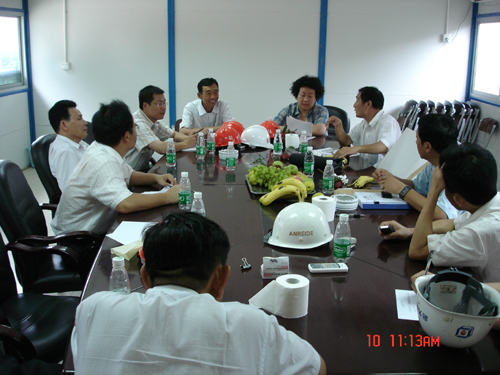 綠海名居工程于七月初申報(bào)了2006年度下半年深圳市優(yōu)質(zhì)結(jié)構(gòu)工程獎(jiǎng)。7月10日,由深圳建筑業(yè)協(xié)會(huì)有關(guān)專家組成的檢查小組蒞臨該工地進(jìn)行第一次檢查,此次主要檢查鋼筋和模板。檢查小組對(duì)現(xiàn)場(chǎng)所見(jiàn)表達(dá)了一致的肯定意見(jiàn)。上圖為檢查小組在項(xiàng)目部會(huì)議室講評(píng)第一次檢查的情況,并提出整改意見(jiàn)。(☆ 周幼瓊/圖)